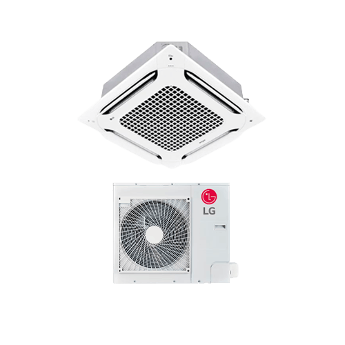 Equipos de climatización empotrados en cielorraso con distribución de aire en cuatro direcciones. Ideales para climatizar locales comerciales, oficinas, restaurantes y espacios de atención al público donde el diseño tiene que quedar limpio y el equipo no ocupa lugar. Disponibles en versiones On/Off e Inverter, en capacidades de 9.000, 15.000 y 18.000 FGS para R410A a 380V.